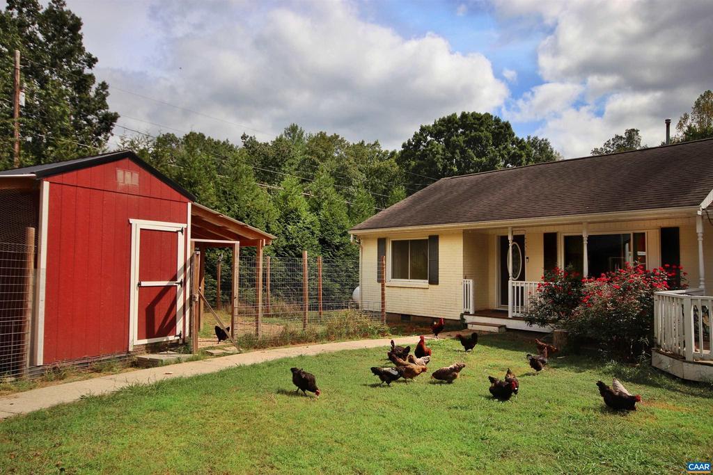 Charming single level living farmette on a county road with gardens, fruit tree orchard, & deluxe chicken coop sitting on one acre with a fully fenced yard. The location blends convenience with country living - centrally located between three shopping centers, just 30 minutes from Charlottesville & surrounded by nature. Step inside from a rocking chair front porch to a living/dining area with recently restored hardwood flooring. Enjoy preparing meals in the bright kitchen with a window view overlooking the backyard garden. Cozy up in the living room next to the wood burning stove or enjoy the changing seasons within the light filled sunroom. Designed with permaculture homesteading in mind, the land surrounding this home features many native species of fruits, orchard trees, and perennials. The paved circular driveway leads to a 2 vehicle carport garage. 2 additional sheds for storage or gardening supplies. Oversized gates for easy transport of lawn equipment. 2024- encapsulated and conditioned crawl space, great for added storage. 2023- chicken coop. 2023- various new gutters with gutter guards. 2022 - wood stove. 2020- fencing installed.,Fireplace in Living Room