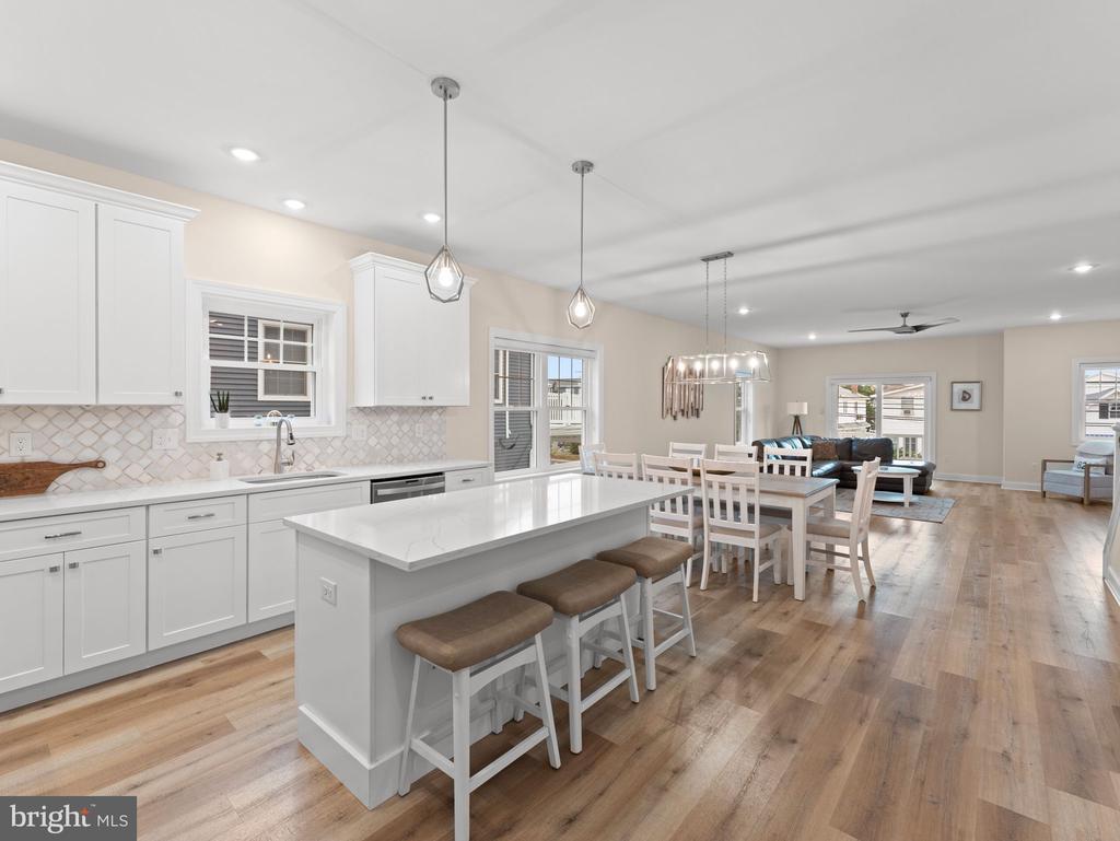 Inside, you’ll find a bright and open floor plan featuring high ceilings, abundant natural light, and premium finishes throughout. The gourmet kitchen is the centerpiece of the home, showcasing sleek cabinetry, stainless steel appliances, and a spacious island perfect for entertaining. Living and dining areas flow seamlessly onto private outdoor spaces, ideal for enjoying sea breezes after a day at the shore.