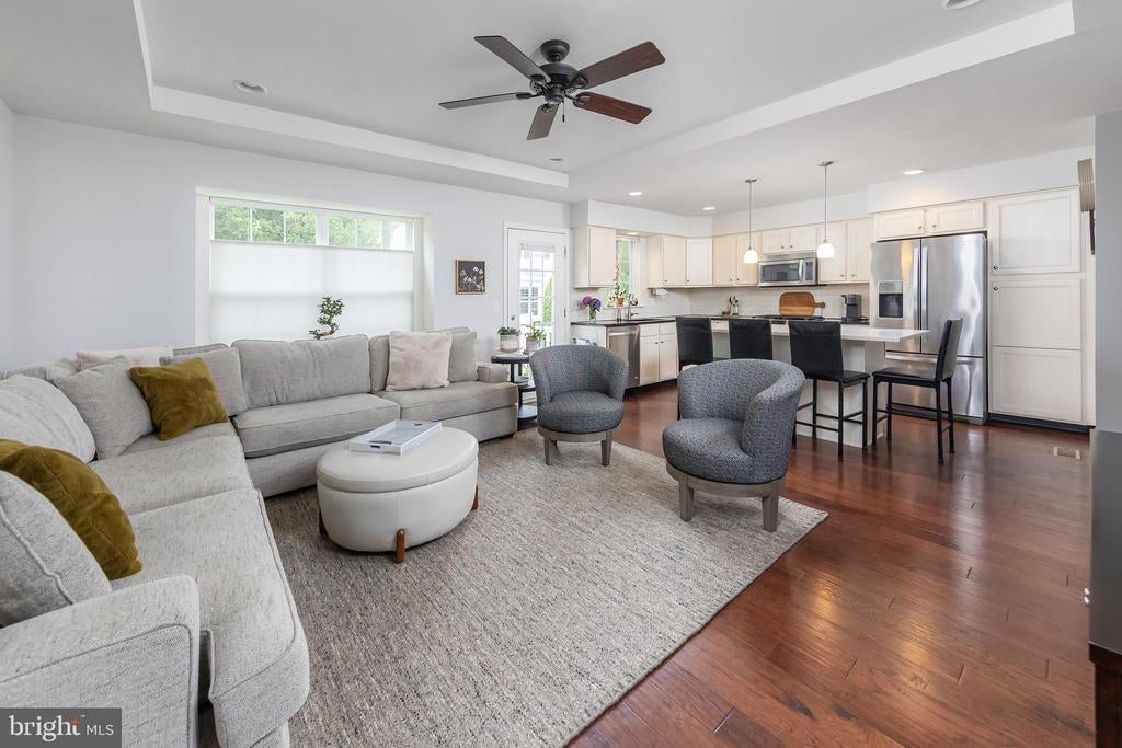 The open-concept kitchen is a standout, featuring upgraded maple cabinetry painted in antique white, black granite countertops along the perimeter, and a beautiful quartz counter top on the island with overhang for bar seating. Stainless steel Whirlpool Gold appliances complete this well-designed space that opens seamlessly to the family room a offering a raised ceiling with fan, recessed lighting and a cozy window seat.