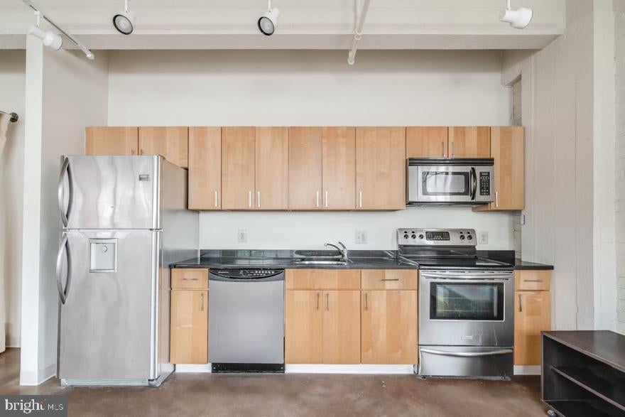 Spacious studio, 1 bathroom in the Waverly Court building, complete with central air, washer/dryer in unit and stainless steel appliances. The studio is a beautiful mix between industrial and modern with concrete floors throughout, high ceilings with exposed air ducts, tall windows, and exposed brick. The kitchen includes stainless steel dishwasher, microwave, refrigerator and electric stove/oven. Finally, the bathroom features classic design of white subway tile shower/tub combination and black and white pinwheel tile flooring.