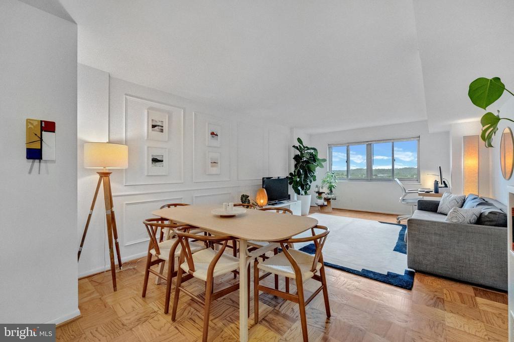 Welcome to Pavilion on the Park! This light-filled and tastefully updated 2-bedroom, 1-bath residence offers 849 sq ft of comfortable living space with thoughtful modern details throughout. Step into the spacious living and dining areas, where chic picture frame molding and oversized windows create a bright, inviting atmosphere. The updated kitchen (2023) features new cabinets, countertops, appliances, flooring, and a stylish herringbone backsplash (2025), making it both functional and sleek. Both bedrooms are generously sized, with the primary offering a walk-in closet. The refreshed bathroom is highlighted by striking black hardware. Beautiful parquet flooring runs throughout, adding warmth and character.