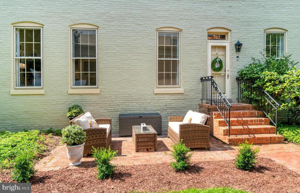 Perfectly positioned in the heart of Old Town, this exceptional Swann Daingerfield condo offers the rare convenience of single-level living on the main floor, complete with a private brick patio framed by lush plantings. The living room showcases over 11-foot ceilings, striking 8-foot windows, a fireplace flanked by custom bookcases, and original heart pine floors that accentuate the historic millwork. An adjacent dining room, featuring another tall window and a dramatic oval window, creates a breathtaking setting elevated by custom wine bar cabinetry. The chef’s kitchen exudes character with a shiplap ceiling, soapstone counters, high-end appliances including Bosch stove and dishwasher, and a stylish backsplash. A hall lined with storage closets leads to two generous bedroom suites overlooking the gardens. The primary suite delights with an enormous walk-in closet and a beautifully renovated bath. A wall of custom cabinetry allows for even more primary room storage needs. The second suite also includes a wall of custom cabinetry, as well as ample closet storage, and updated private bathroom. Additional conveniences include a deeded assigned parking space (#2) and a private lower-level 10 x 8 foot storage unit for oversized belongings. This home masterfully blends the Old Town elegance with modern comforts—soaring ceilings, massive windows, and thoughtful renovations—making it truly one-of-a-kind. Built in 1802, own a piece of history at Swann Dangerfield condominium. Just moments away from the phenomenal restaurants and shopping that Old Town Alexandria has to offer.